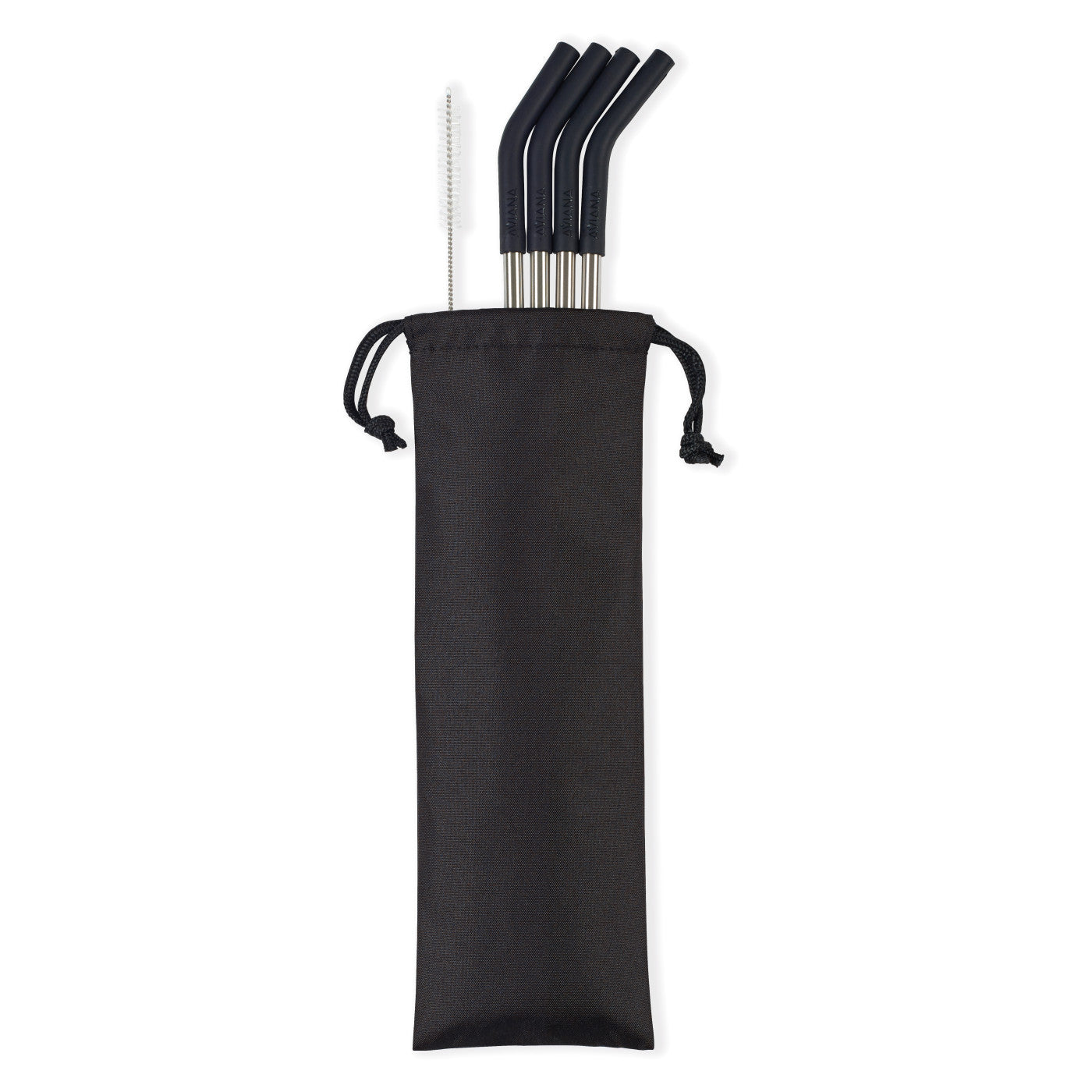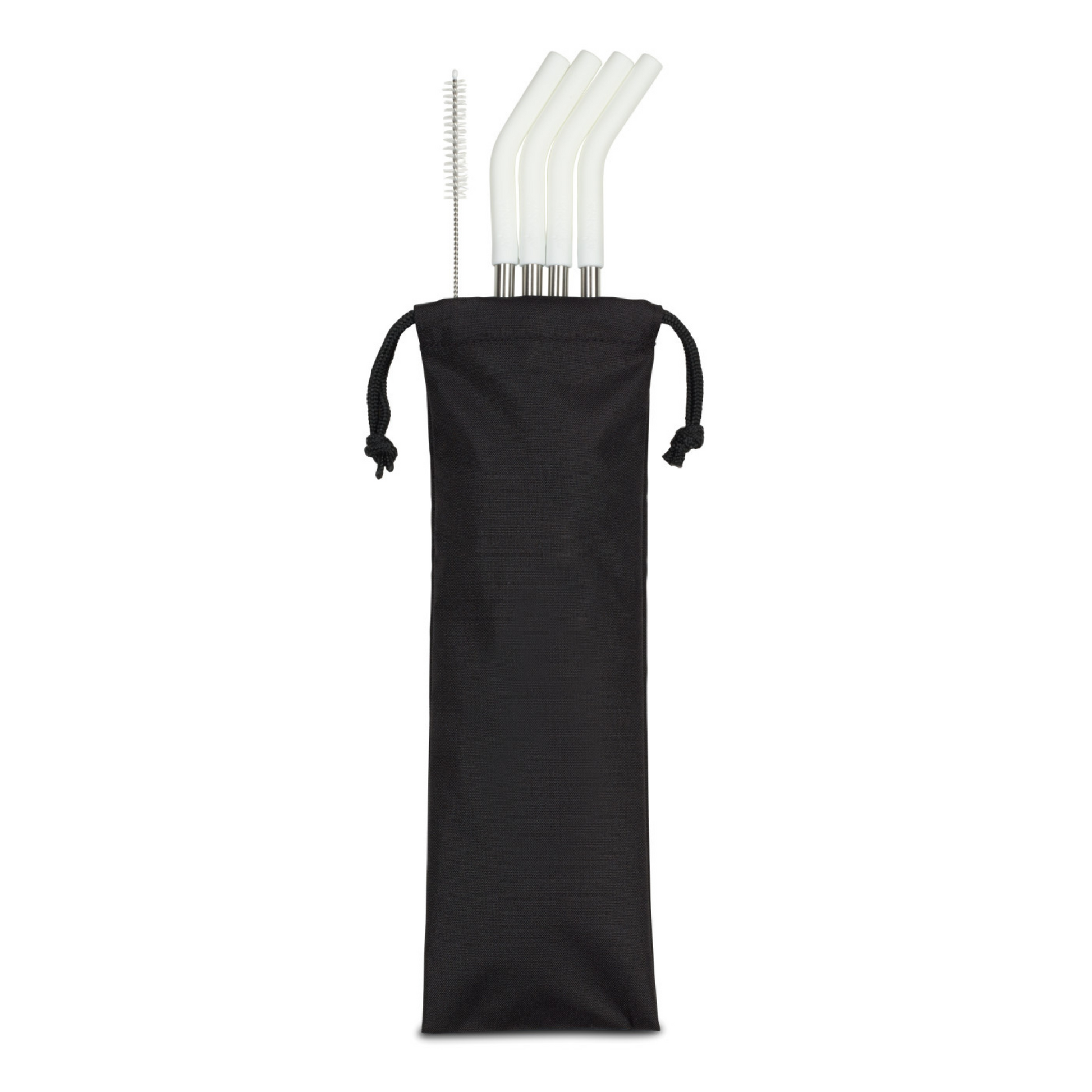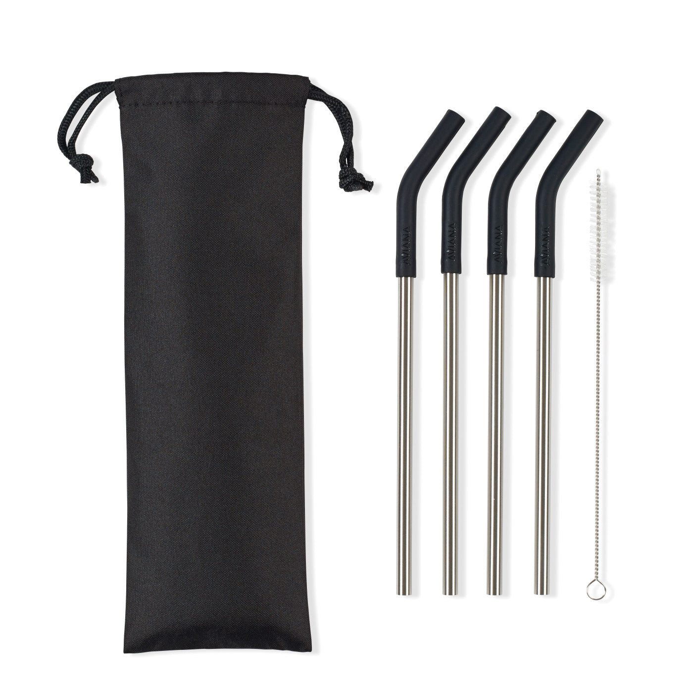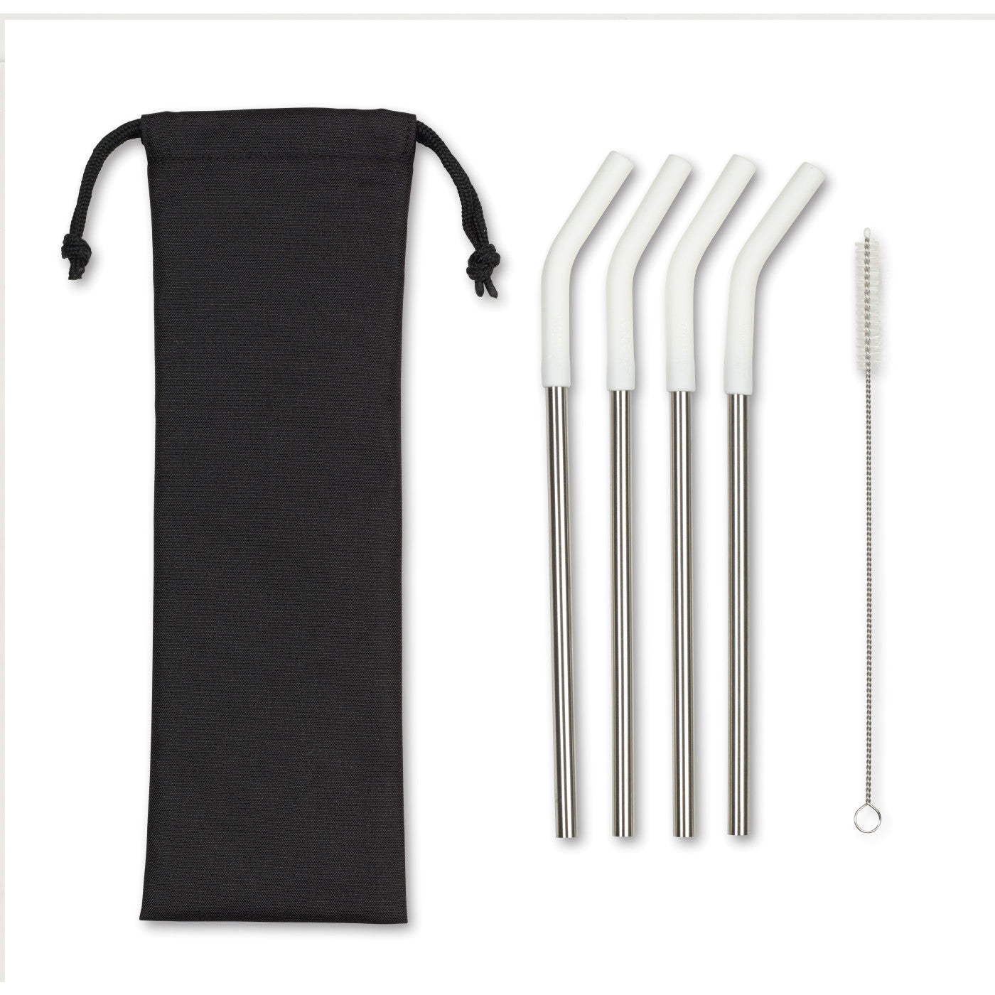 Set of four straws come in a reusable travel pouch. Base is stainless steel with silicone top for comfortable sipping. Set includes a straw cleaning brush for easy care, hand wash recommended (dishwasher safe, top rack).
