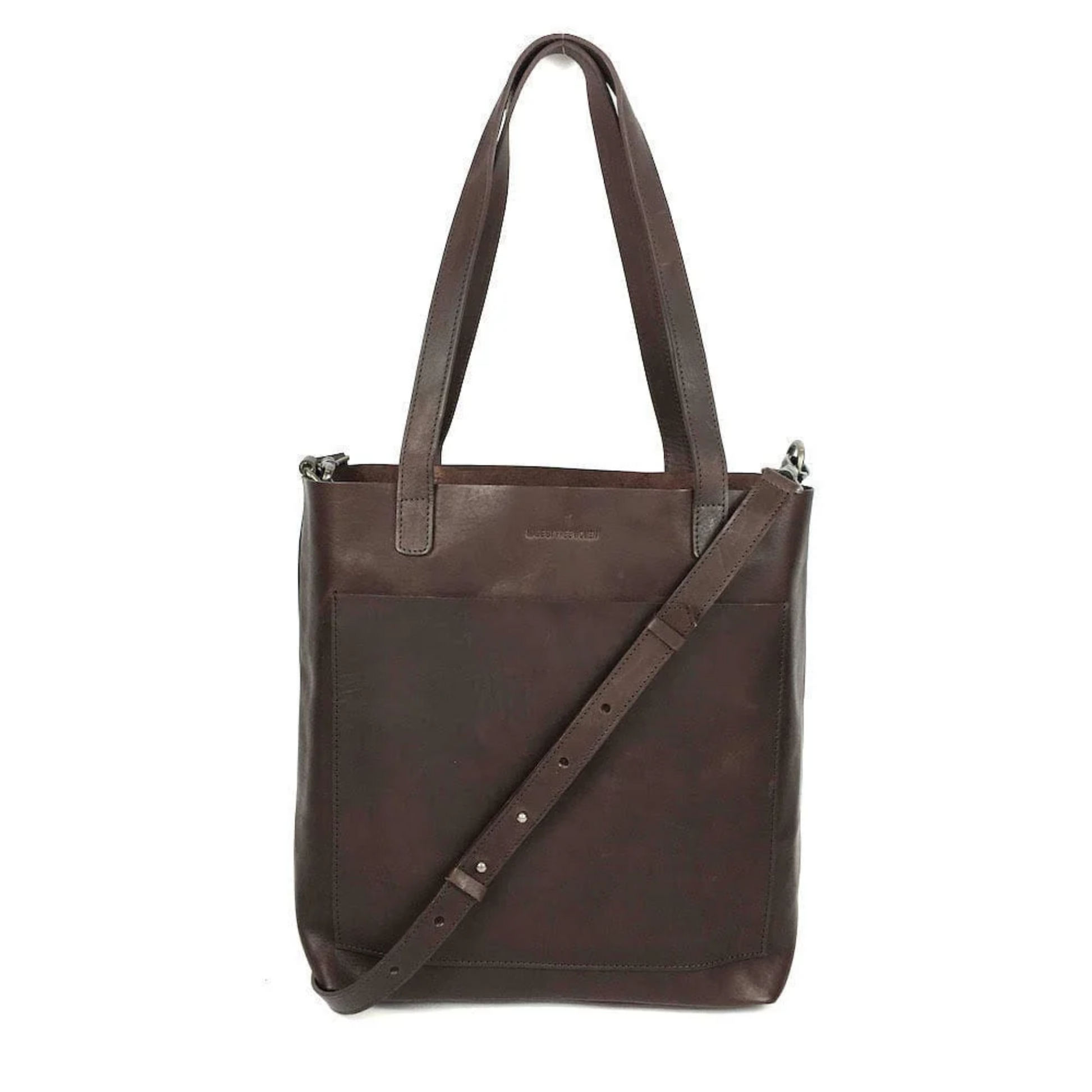 Handcrafted from the finest eco-friendly, vegetable tanned, biodegradable leather. With strong leather handles, large inside and outside pockets, and a removable adjustable shoulder strap, this full-featured medium-sized tote is a practical addition to any bag collection.